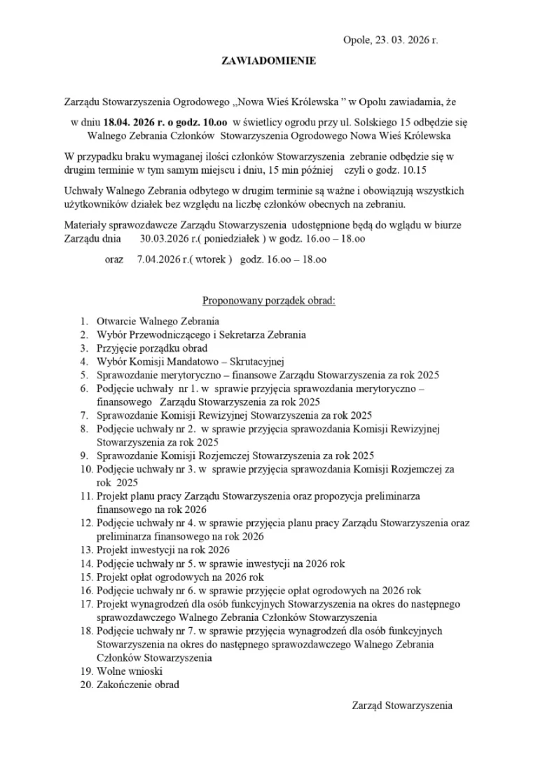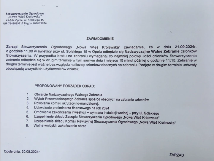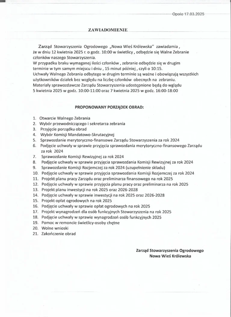 Zarząd Stowarzyszenia Ogrodowego „Nowa Wieś Królewska” zaprasza członków na Nadzwyczajne Walne Zebranie, które odbędzie się 21 września 2024 r. o